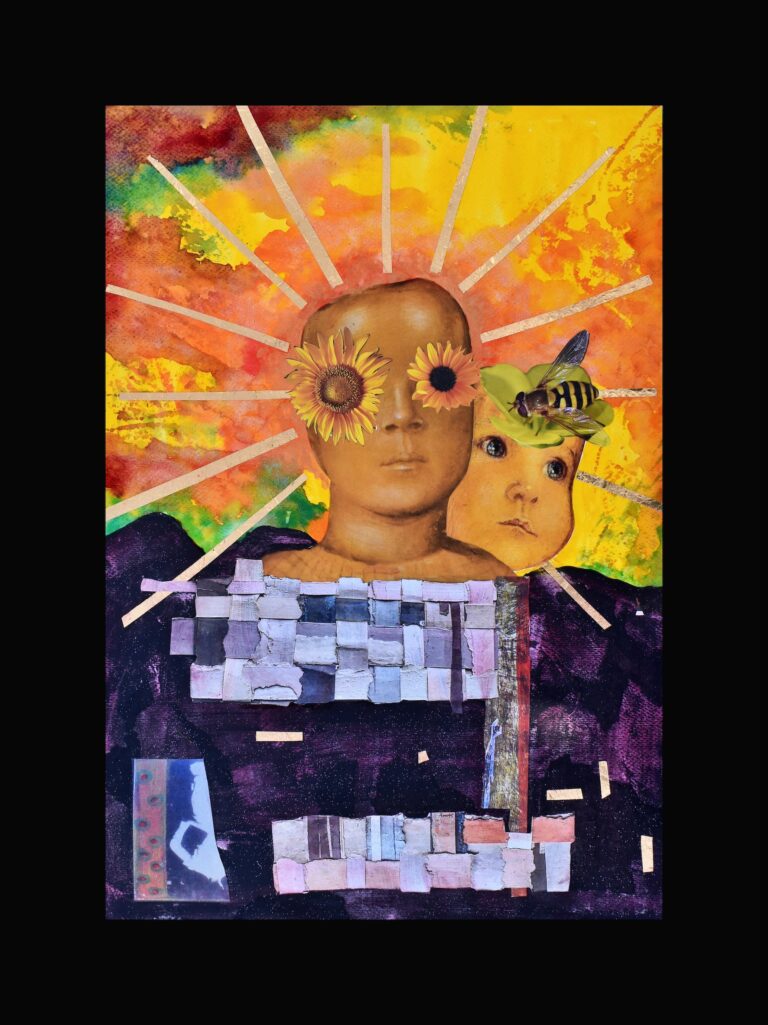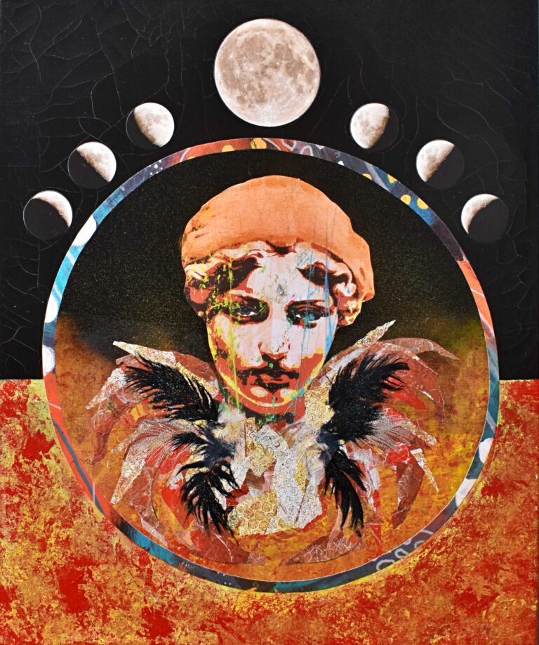 Mixed media/collage on canvas. Varnished. Dimensions: 50×50 cm. Year: 2024. 1800 DKK