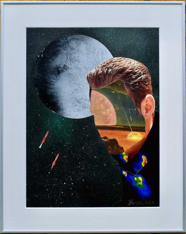 Mixed media/collage. Aluminum frame with glass. Dimensions: 44×56 cm. Year: 2023. 2200 DKK
