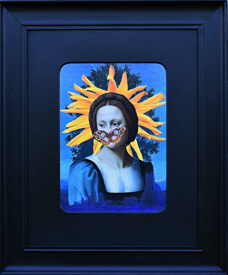 Mixed media/collage Aluminum frame with glass. Dimensions: 50×50 cm. Year: 2024. 1800 DKK